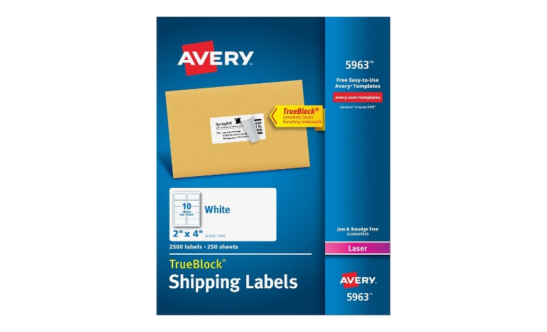 Avery Printable Shipping Labels with Sure Feed, 2" x 4", White, 2,500 ... This item: Avery Printable Shipping Labels with Sure Feed, 2" x 4", White, 2,500 Blank Mailing Labels (5963) $67.59 ($0.03/Count) Avery Shipping Address Labels, Laser Printers, 1,000 Labels, 2x4 Labels, Permanent Adhesive, TrueBlock (5163) $33.32 ($0.03/Count) Sharpie Permanent Markers, Fine Point, Black, 36 Count $21.99 ($0.61/Count)